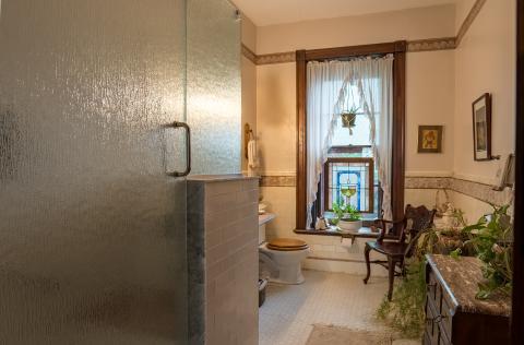 Step outtside your room and you'll find a shared luxurious share bathroom, lined with stunning embossed tiles and featuring a marble sink. The walk-in shower, complete with a convenient seat, adds a touch of spa-like comfort to your stay. With its unique charm and thoughtful touches, Carol's Room promises a restful and memorable experience.